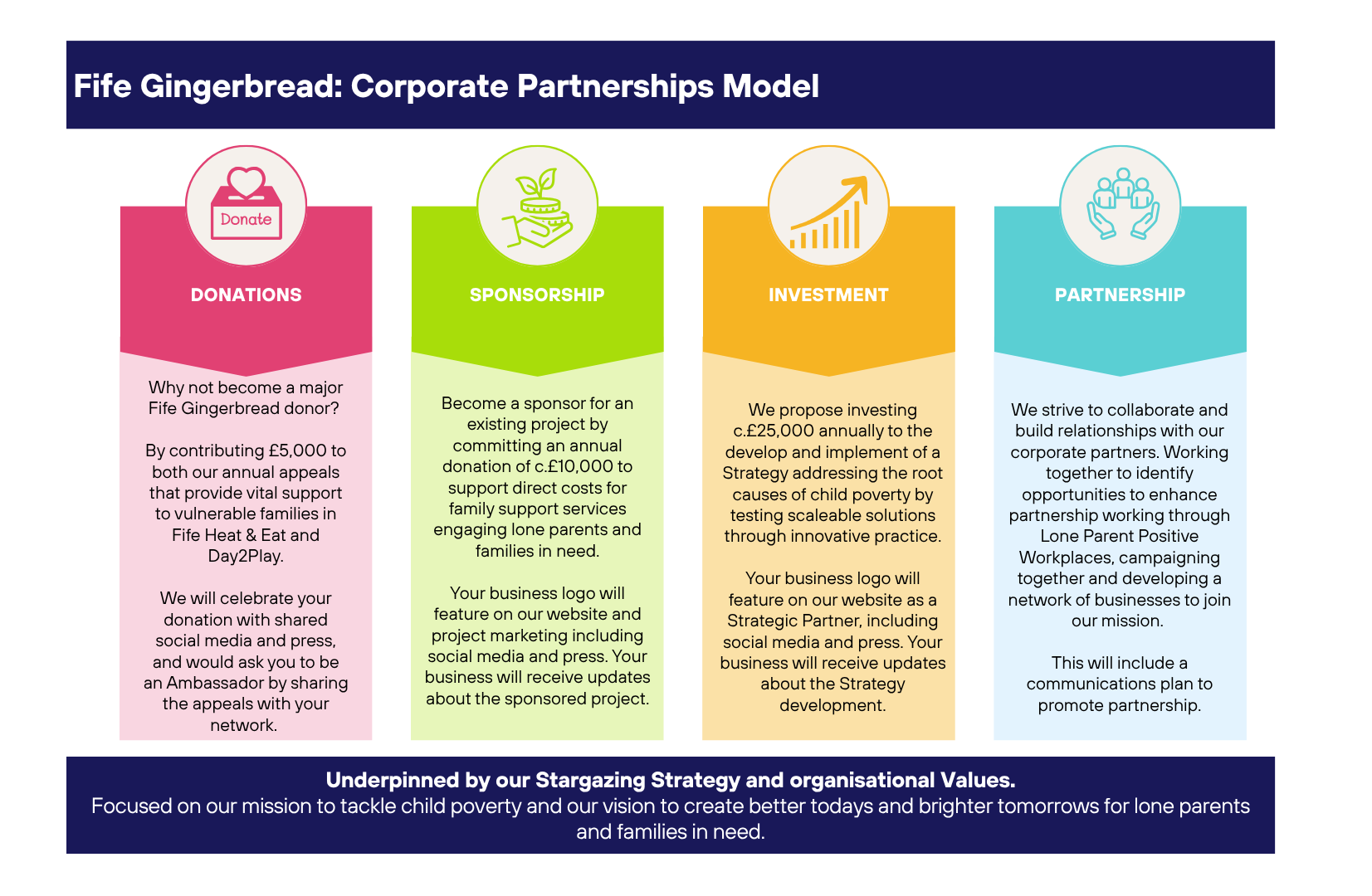 Following on from our ‘Stargazing’ Strategy, we want to build on this foundation of trust and collaboration. This has led to creating our Business Development Manager post, providing sponsorship and investment opportunities to help break the poverty cycle in Fife, that could impact policy change across Scotland.